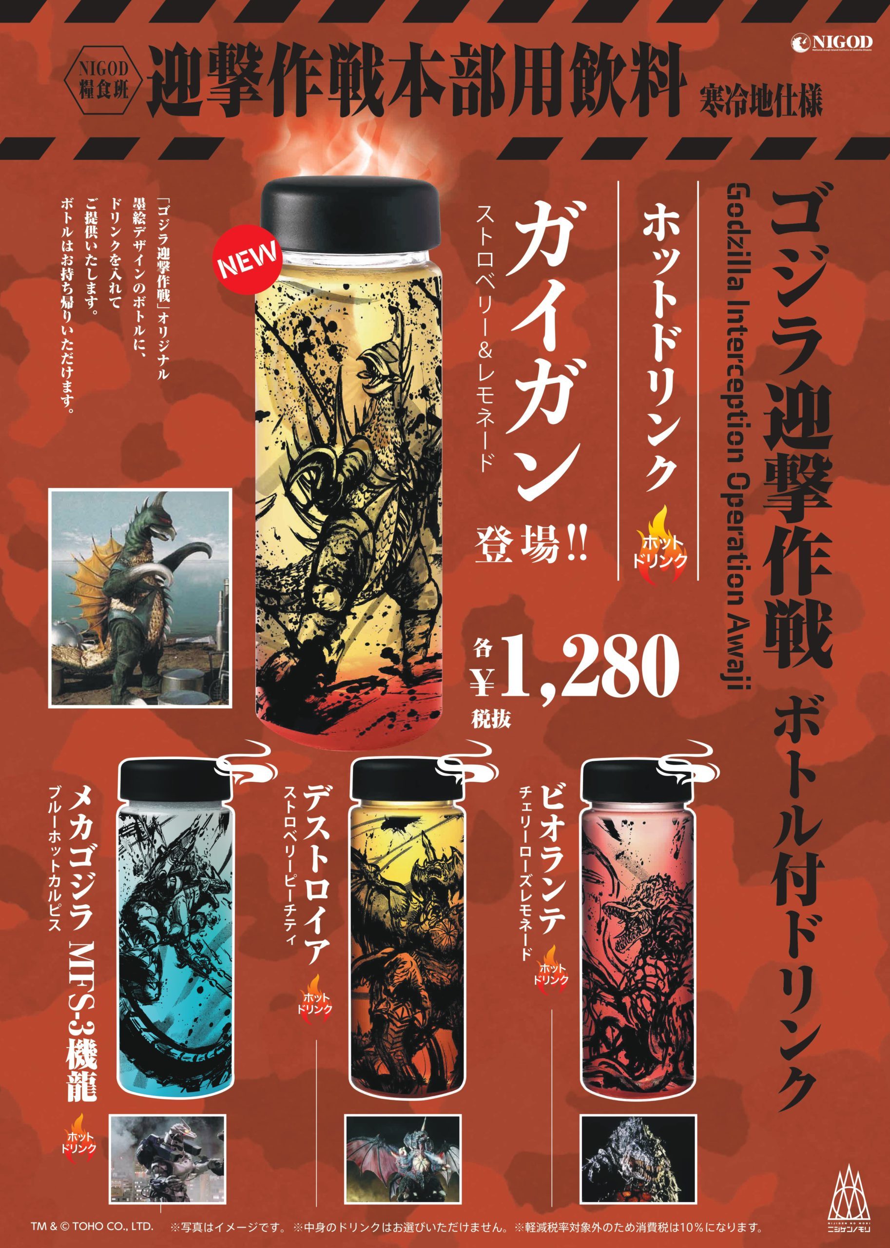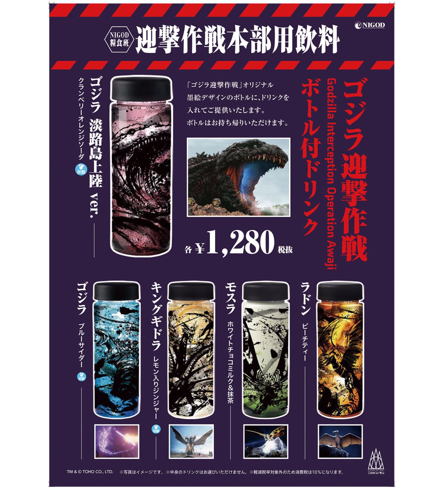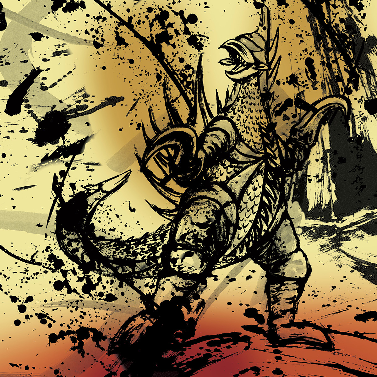 兵庫県立淡路島公園アニメパーク「ニジゲンノモリ」の新アトラクション『ゴジラ迎撃作戦 ~国立ゴジラ淡路島研究センター~ 』内で販売される商品に使用される怪獣の墨絵イラスト。(墨絵イラストのみ作製、パッケージデザインは㈲トレスアミーゴス様)