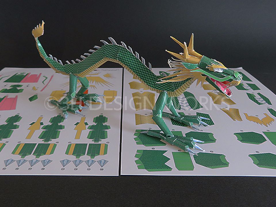 醜い戦争!子供でも首をかしげる戦争の屁理屈、今年の初めには生きていた命がいくつ失われたのか・・・「ウクライナに青い空を・・・」という願いから着想したものです。飛んで来てほしくないミサイルのようなものが、見たくないのにいっぱい飛んできたことでしょう。この醜い戦争が、一日も早く終わってくれることを願って・・・、人知の及ばない神の力で、5色の龍の神よ!戦争を仕掛けるものにどうか天罰を!・・・ もともと、龍単体のペーパークラフトとして作った作品に、着想に従い5色に彩色し、展開図を再構成することによって新たに抽象画のような作品を生み出す!No War!の願いを込めて!平面の展開図により表現された絵には実は5色の龍が隠されている!全てのパーツを切り離して組み立てると5色の龍になるのです!
