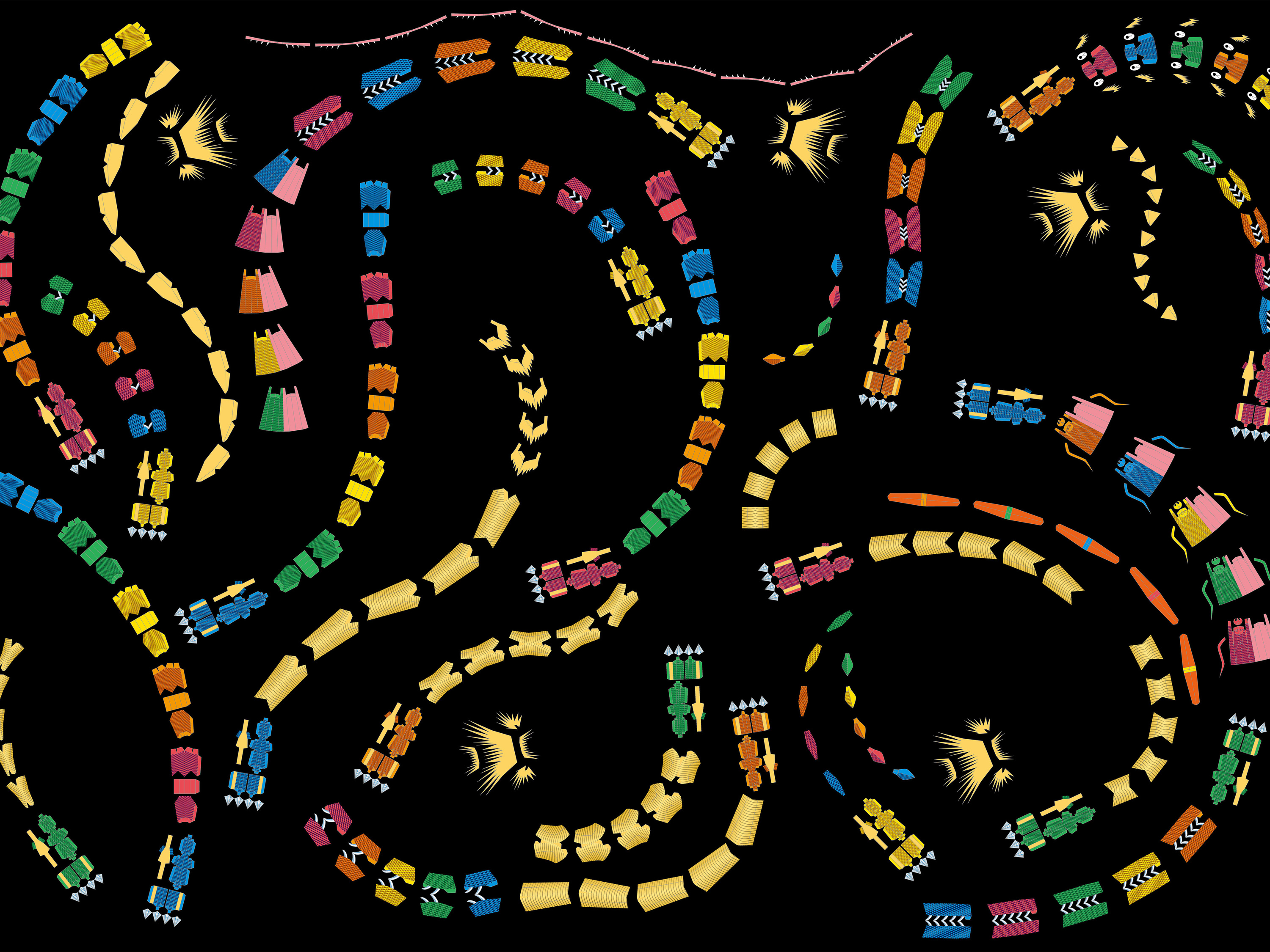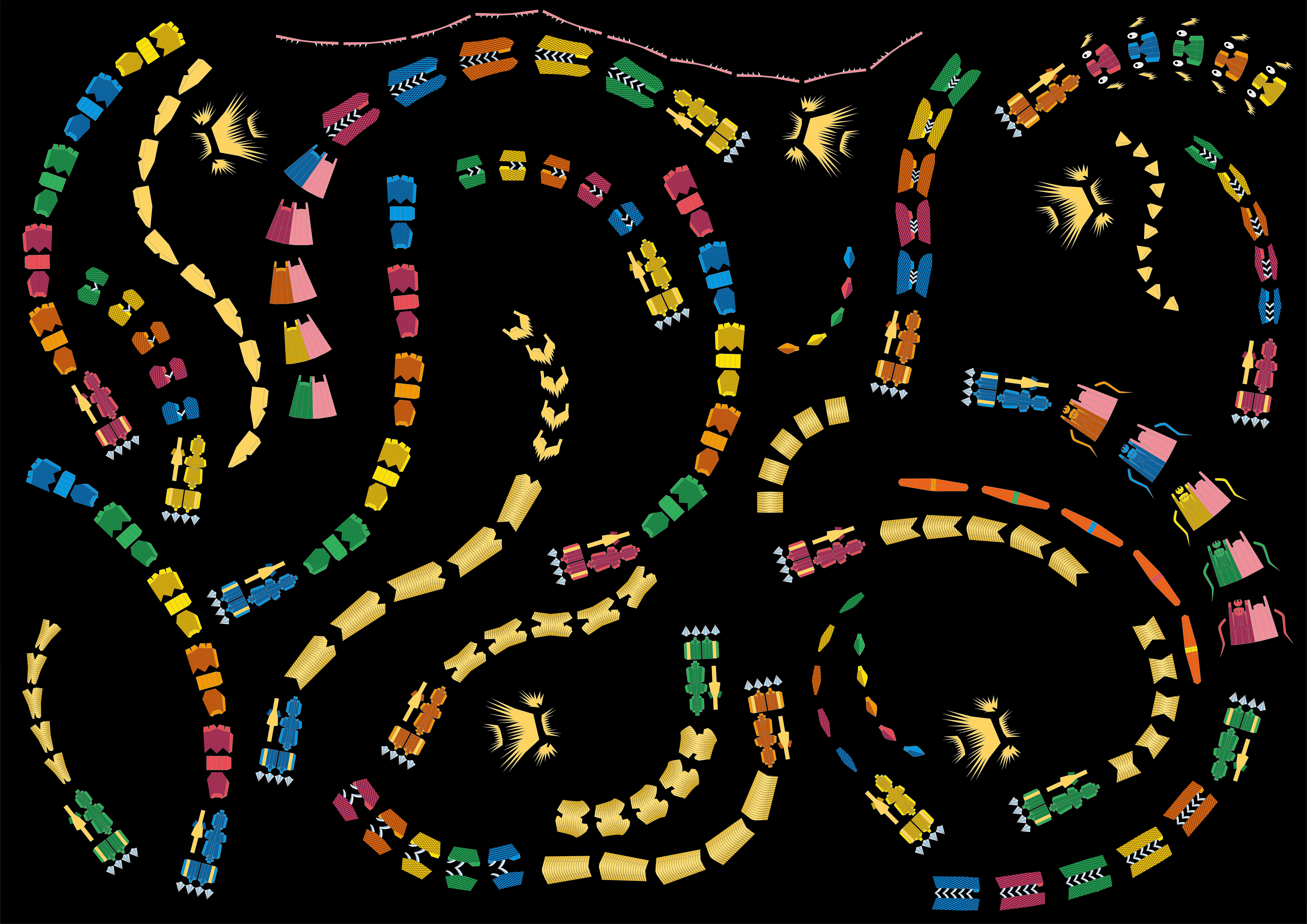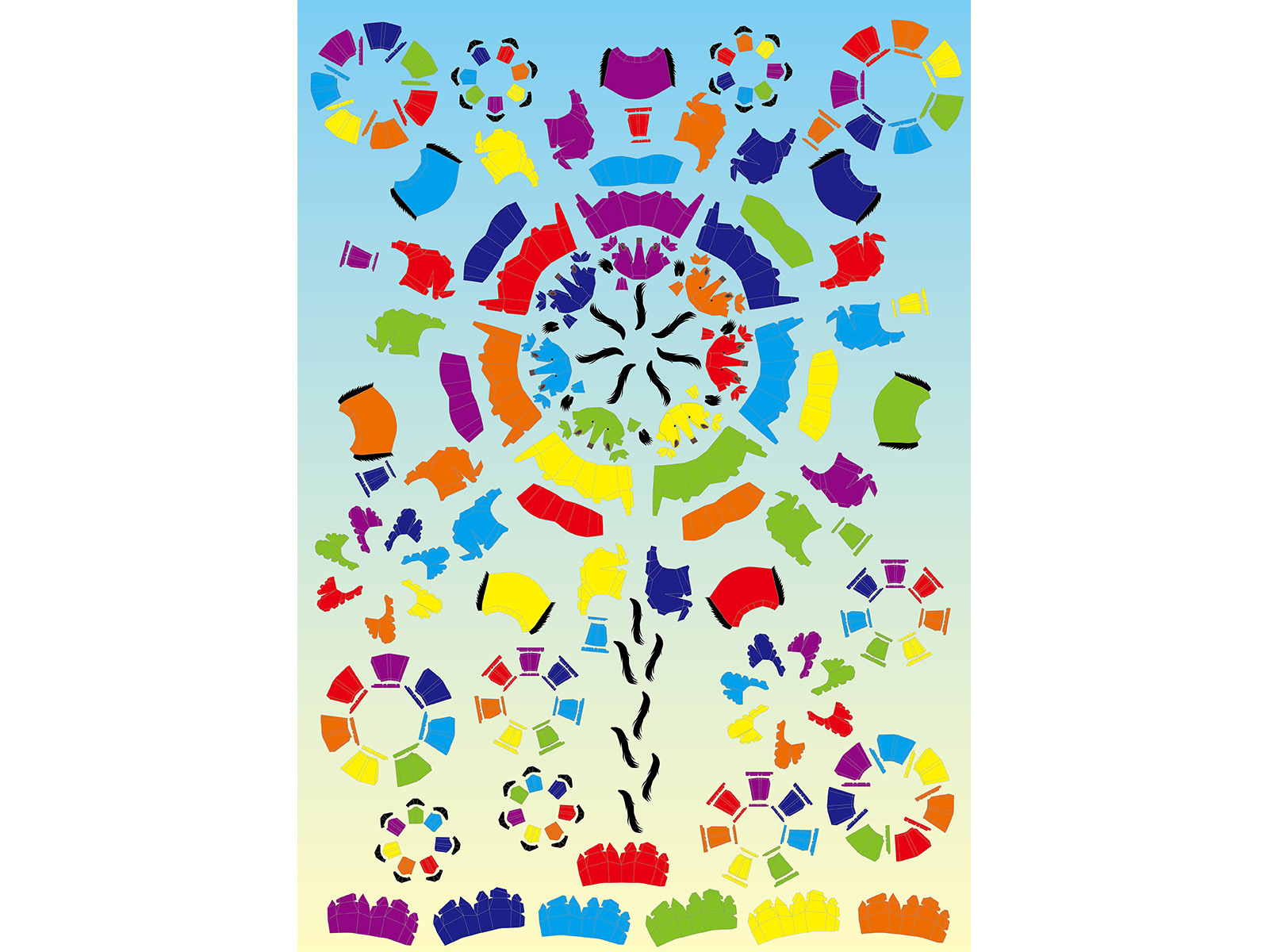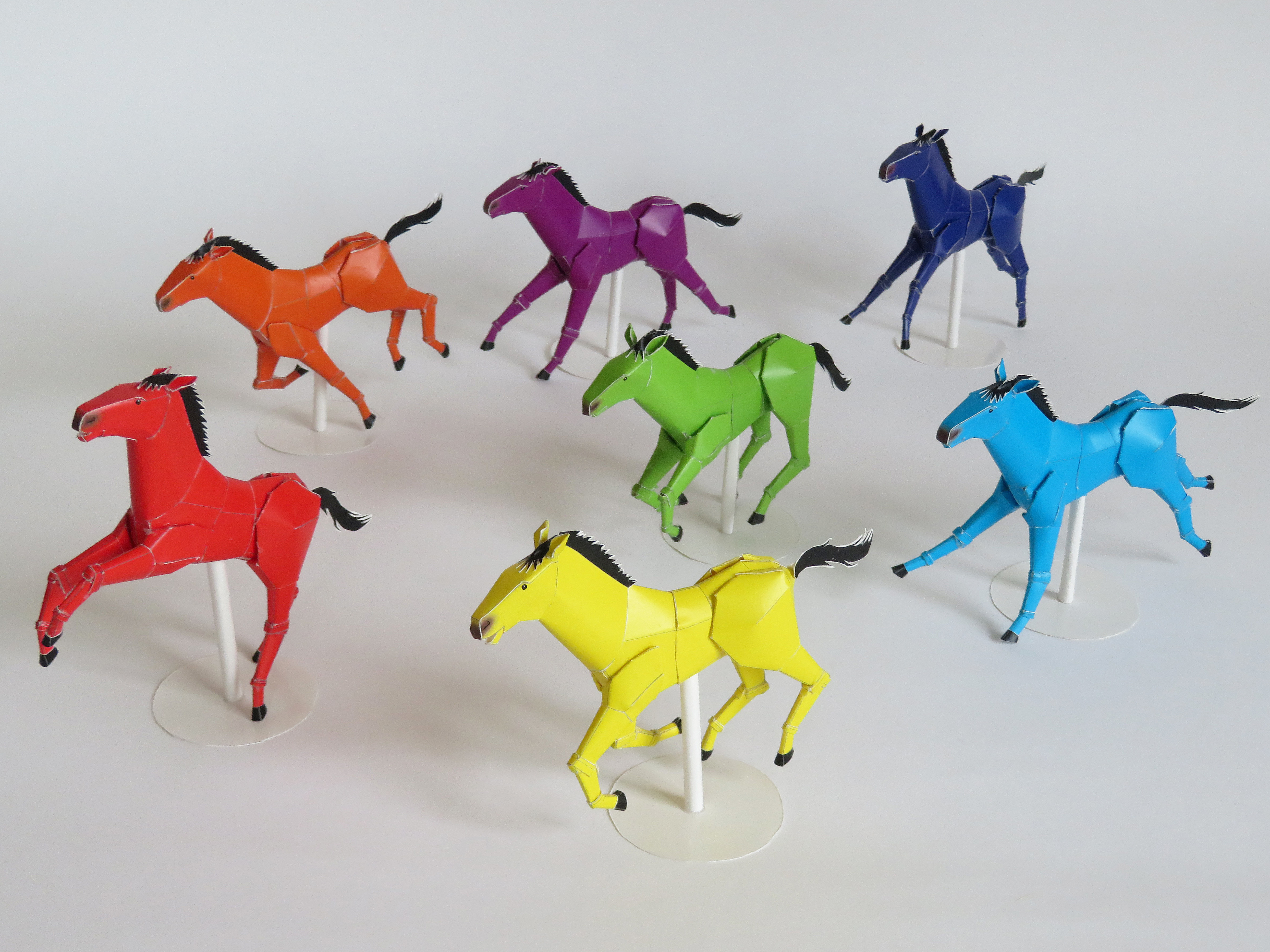 エリザベス女王ご逝去の後、虹がかかったニュースを見た時、着想しました。平和を願い駆けぬける虹の馬たち!もともと、馬単体のペーパークラフトとして作った作品に、着想に従い7色に彩色し、展開図を再構成することによって新たに抽象画のような作品を生み出す!これは花なのか?花火なのか、空に浮かぶ雲なのか?見る人によっていろいろなものに見えて欲しい、自由なアート作品です。平面の展開図により表現された絵には、実は7色の馬が隠されている!全てのパーツを切り離して組み立てると虹色の馬になるのです!
