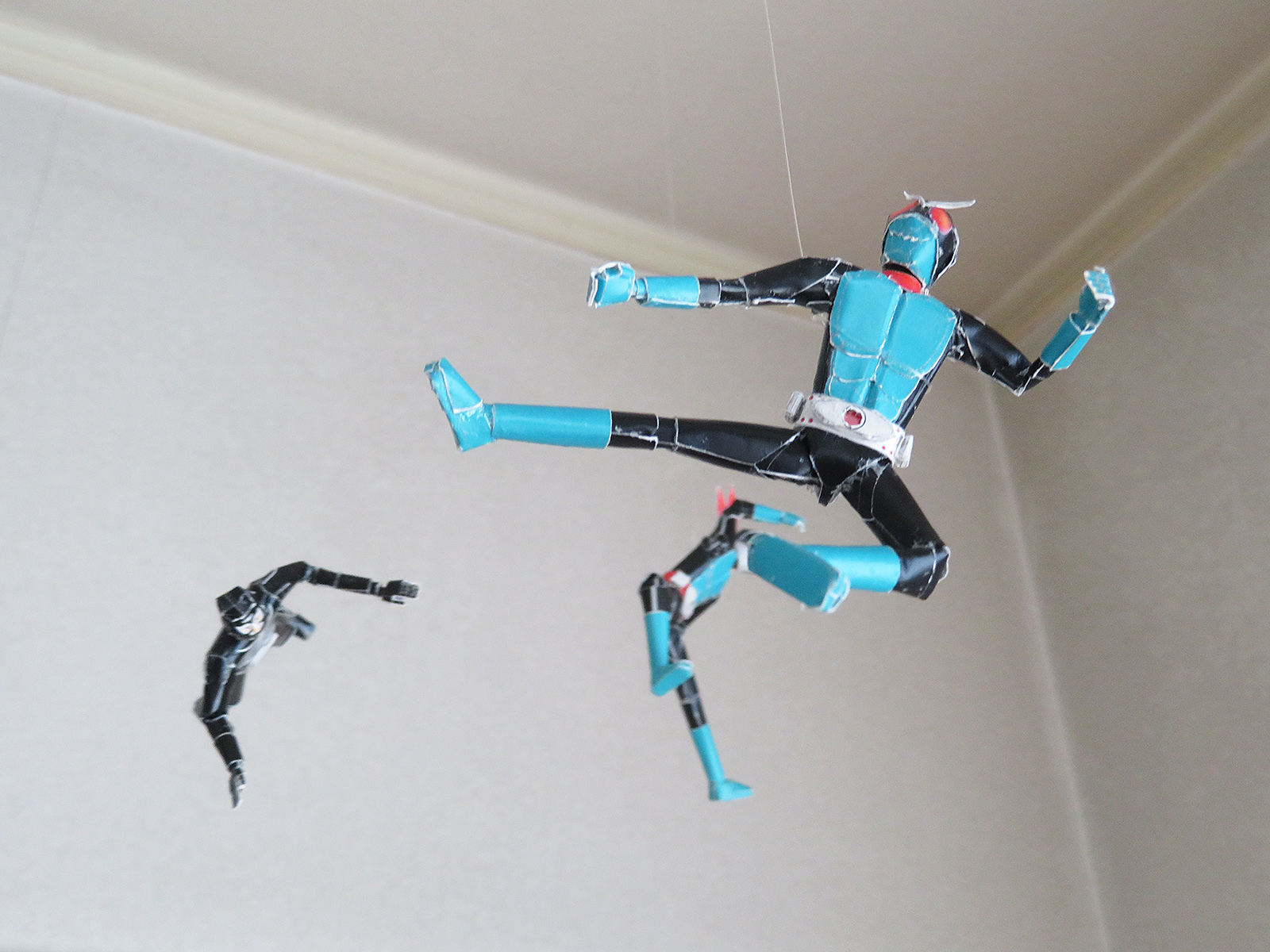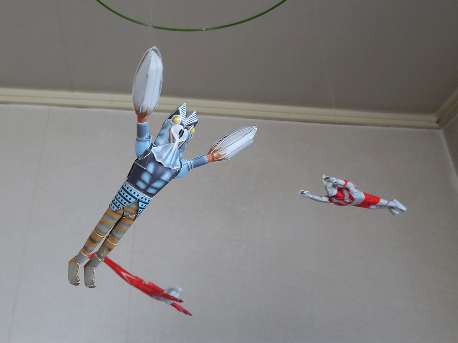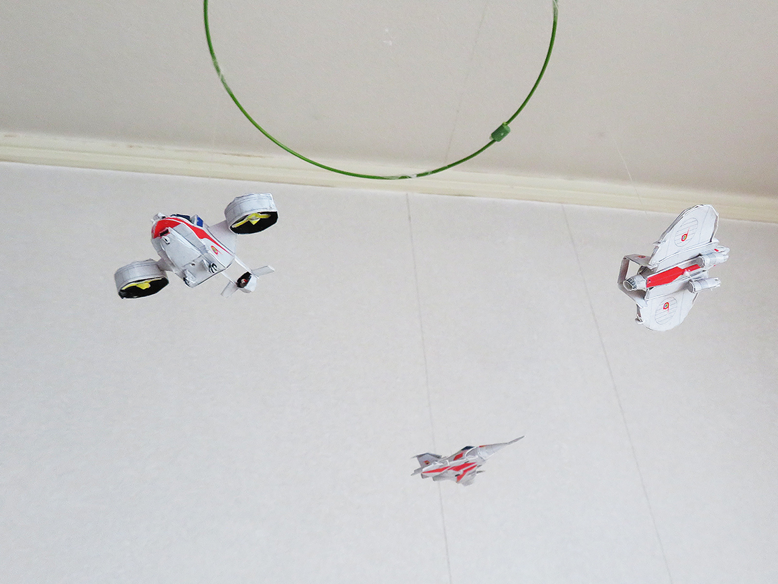 本ペーパークラフトによるモビールの作例です。紙なので軽く、落ちて人に当たっても怪我はしませんので安全です。